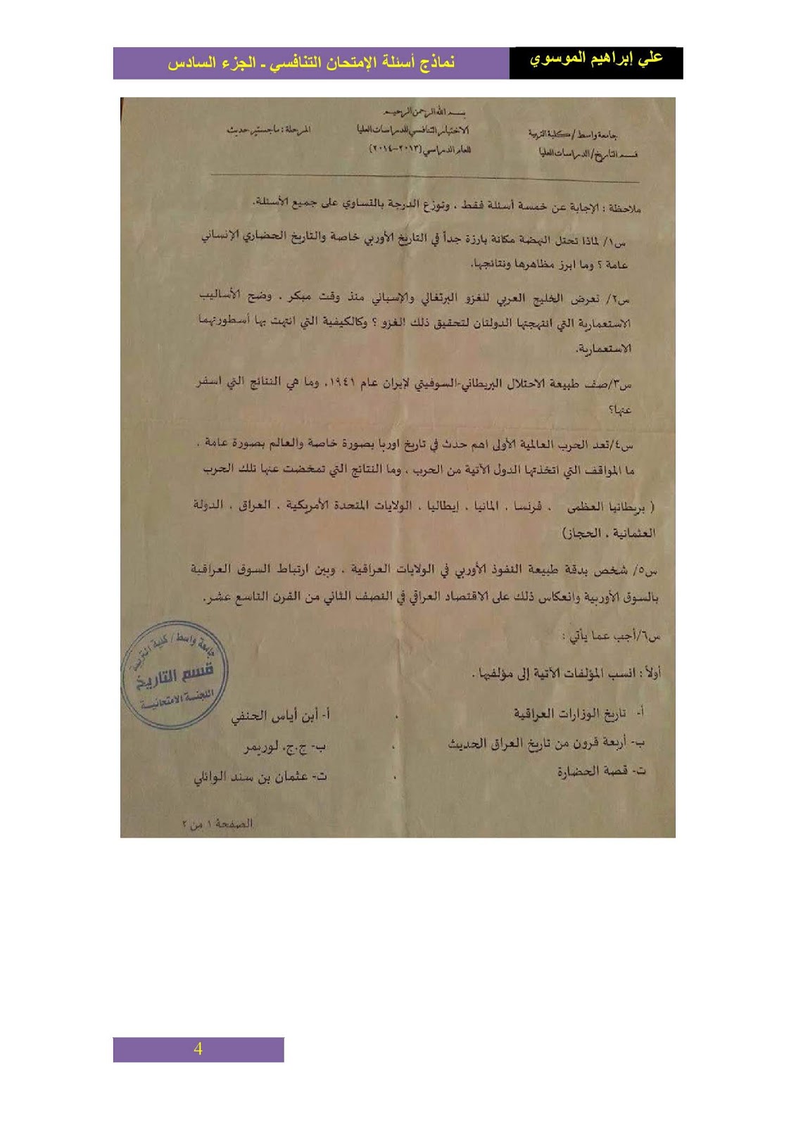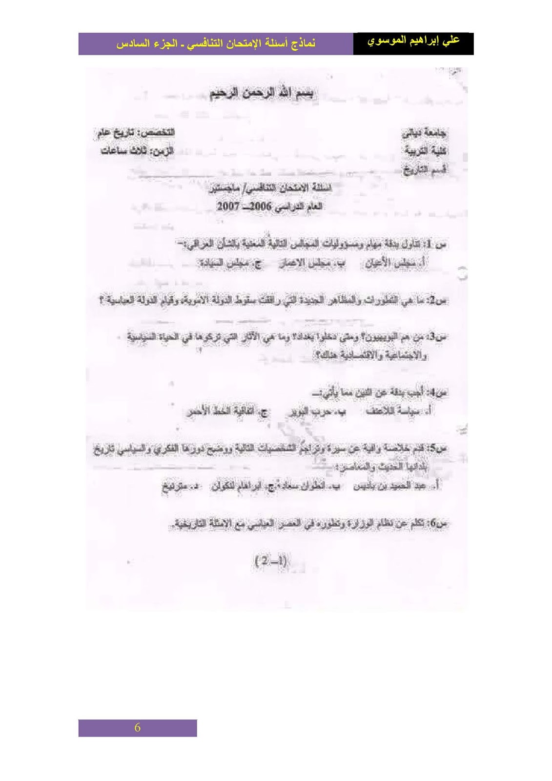 نماذج اسئلة الامتحان التنافسي ماجستير كلية التربية قسم التاريخ الدراسات العليا