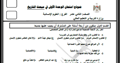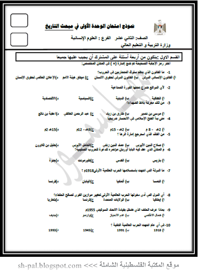 نموذج امتحان في الوحدة الأولى لمبحث التاريخ للصف الثاني عشر المكتبة الفلسطينية الشاملة