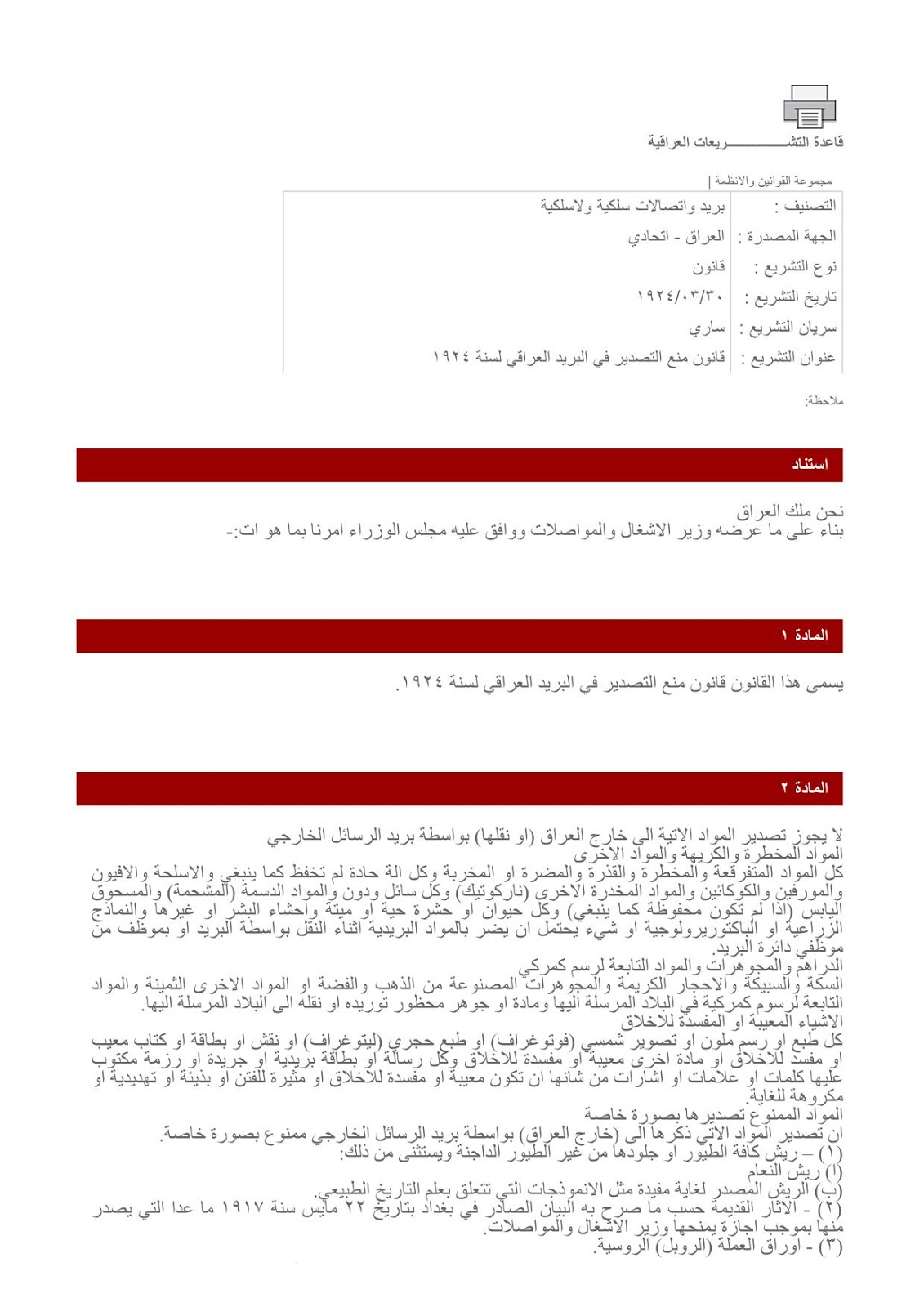 قانون منع التصدير في البريد العراقي لسنة 1924