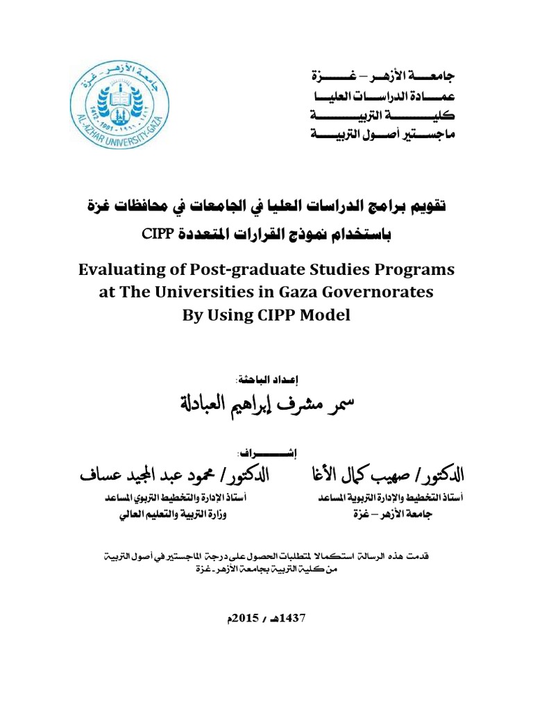 Evaluating Of Post Graduate Studies Programs At The Universities In Gaza Governorates By Using Cipp Model