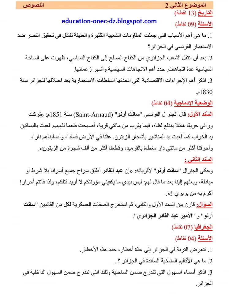 مقتطفات وعموميات أسئلة التاريخ والجغرافيا السنة الرابعة متوسط الجيل الثاني موقع الأستاذ حاجي عبد النور Site Prof Hadji Abdenour