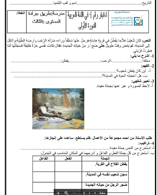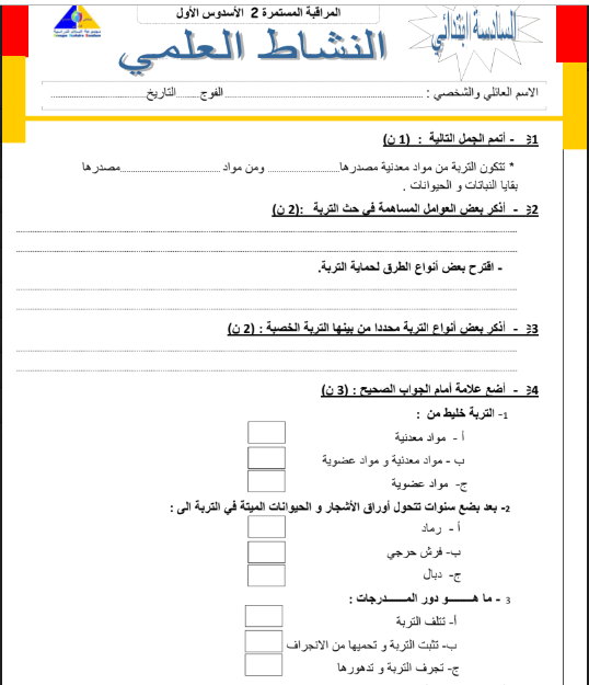 النموذج الأول الاختبار و الفرض الثاني رقم 2 في مادة النشاط العلمي خلال الدورة الأولى مستوى السنة السادسة ابتدائي