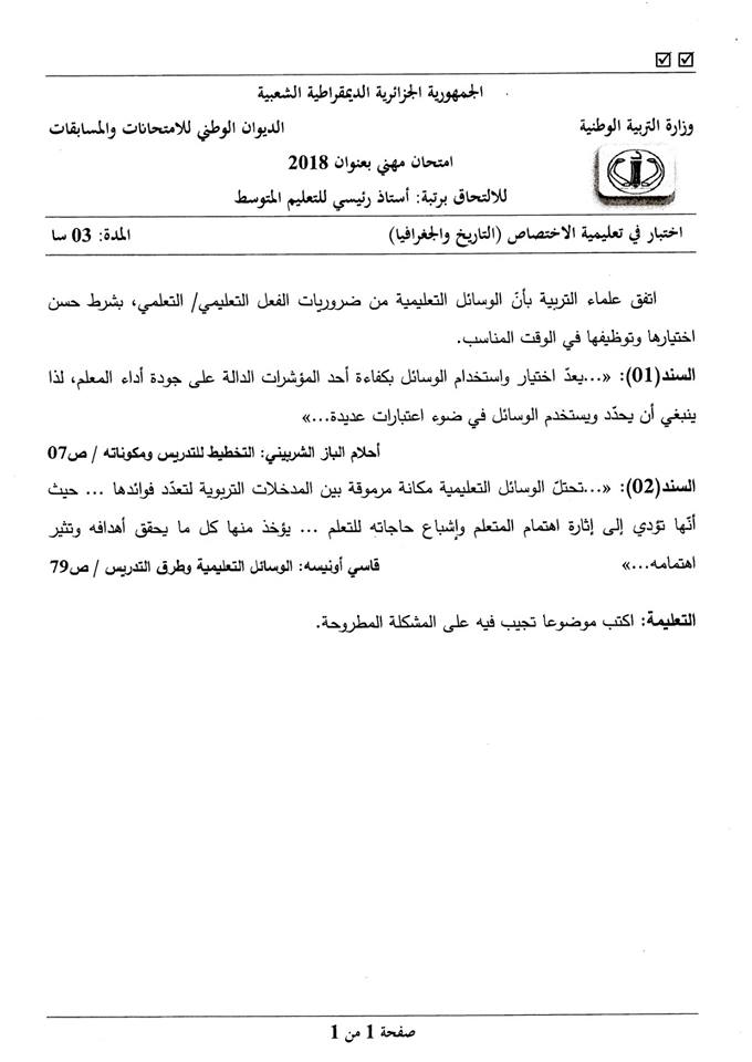 موضوع اختبارتعليمية التاريخ والجغرافيا مع الاجابة النموذجية لمسابقة استاذ رئيسي في التعليم المتوسط 2018